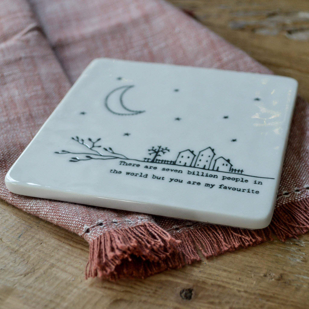 A hand finished porcelain coaster by East of India. Felt backed, this coaster displays a homespun illustration and carries the message " There are seven billion people in the world but you are my favorite".