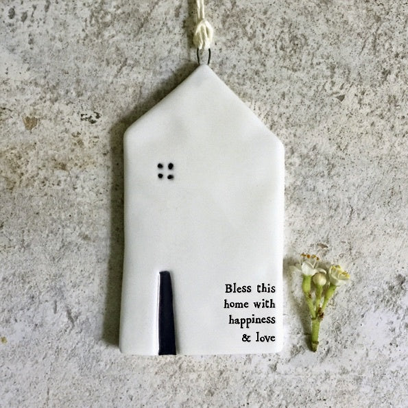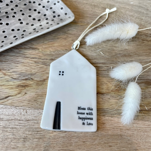This hanging porcelain house embossed with black font saying: Bless This Home with Happiness & Love.