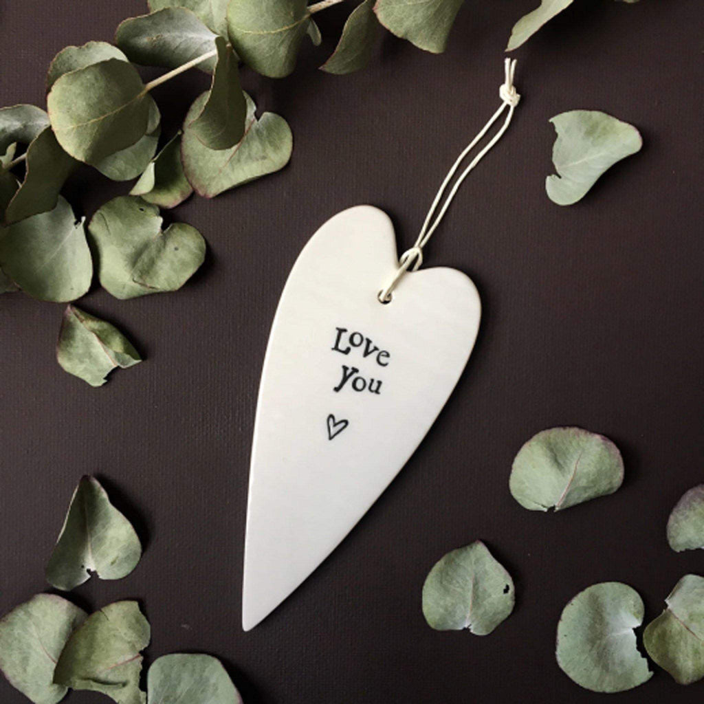Absolutely stunning long heart made from porcelain. This one says 'Love You'. Measures: 6cm wide x 14cm Long (19cm including string)