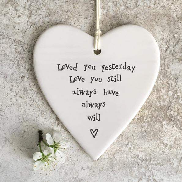 A hand finished porcelain heart hanger by East of India. Strung on paper string, this porcelain plaque shaped like a heart and carries the message " Loved you yesterday, love you still, always have, always will"