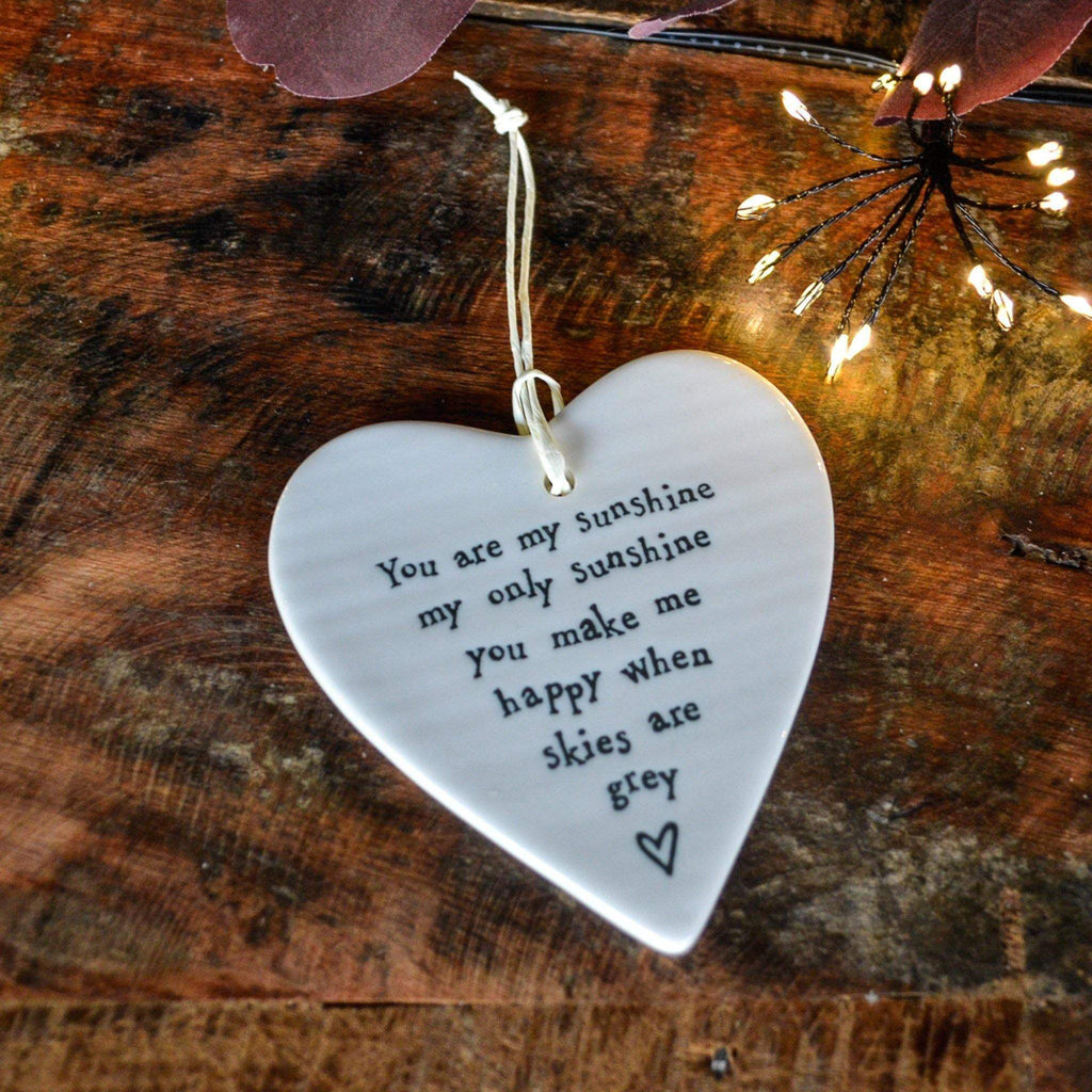 A hand finished porcelain hanger by East of India. Strung on paper string, this porcelain plaque shaped like a heart and carries the message " You are my sunshine, my only sunshine, you make me happy when skies are grey"