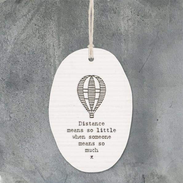 A hand finished porcelain hanger by East of India. Strung on paper string, this oval chaped porcelain plaque is, illustrated with a whimsical hot air balloon and carries the message " Distance means so little when someone means so much"