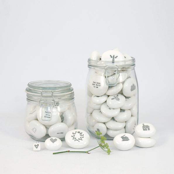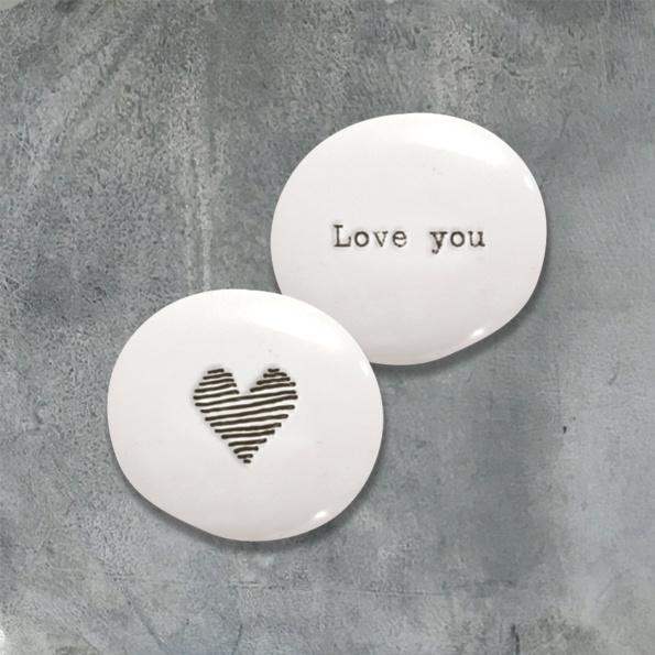 Porcelain Pebble - Heart/Love You,is made of smooth porcelain, making it lovely to hold. This double sided pebble features an illustrated image on one side and text on the other, to let your loved one know you're thinking about them.
