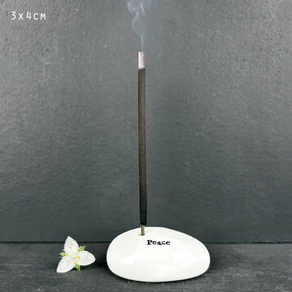 A pretty porcelain pebble incense holder embossed with PEACE in black typewriter font.