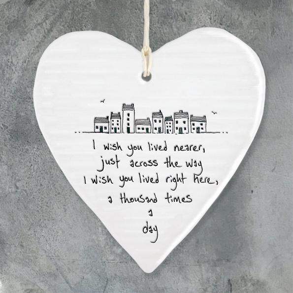 A hand finished porcelain hanger by East of India. Strung on paper string, this porcelain plaque shaped like a heart, illustrated with whimsical houses and carries the message " I wish you lived nearer, just across the way, I wish you lived right here a thousand times a day"