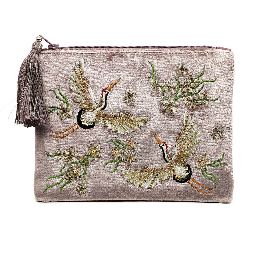 Super soft mink velvet purse, embroidered with a flying crane design, embellished flowers and a fun tassel zip.