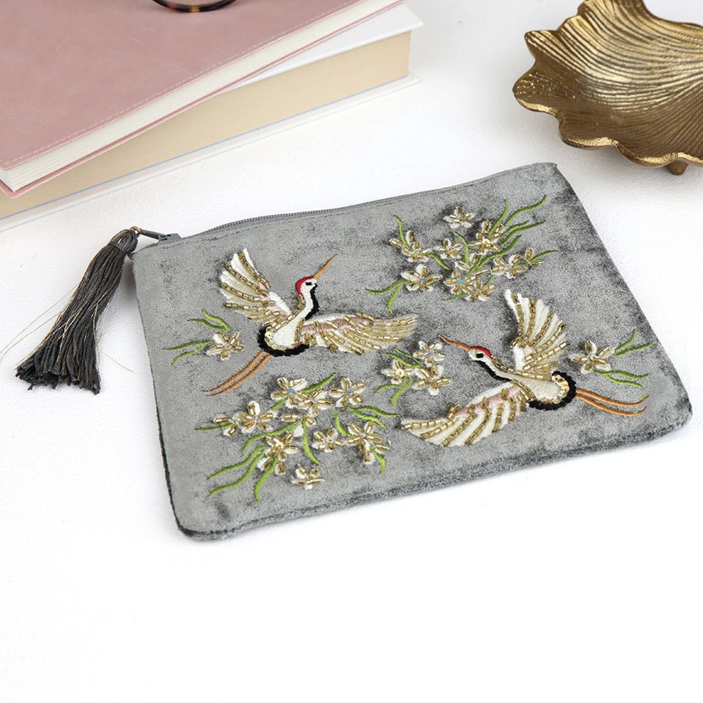 Purse Pouch - Smoke Grey Embroidered Cranes. Grey velvet purse with embroidered flying crane design, embellished flowers and a fun tassel zip. A gorgeous gift for yourself or a friend. The perfect pouch for essentials while you travel, small items of makeup or as a purse.