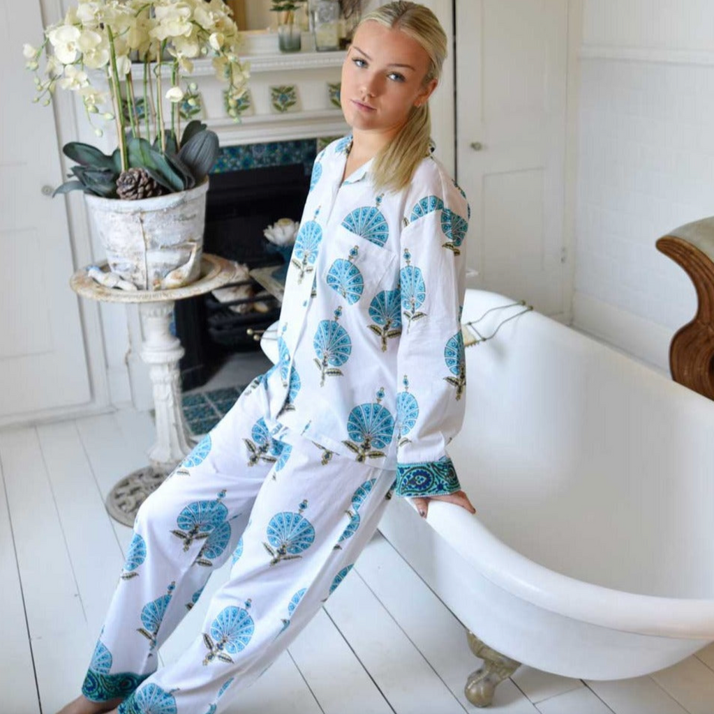 Pyjamas - White & Aqua Shell features vibrant and happy print of a bohemian aqua blue shell motig.