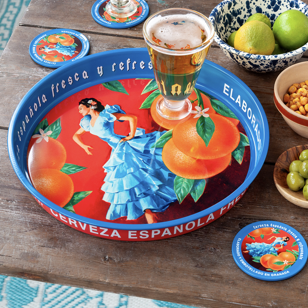 This tinplate metal serving tray, featuring a beautiful print of a lady and oranges with "Cool and refreshing Spanish beer" branding, inspired by vintage Spanish beer packaging.