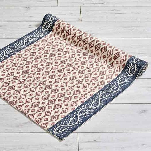 This Cotton Floor Runner Rug adds a touch of style to any room in your home. Featuring screen-printed organic spice red patterns with a contrasting navy green border, it offers a subtle yet timeless design that will effortlessly liven up your space.