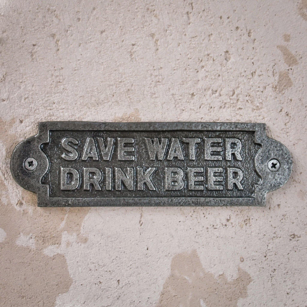 Save water, drink beer! This humorous plaque would be a perfect gift for the beer lover in your life. With industrial styling, this cast iron plaque has a screw hole at either end and could easily be attached to a wooden door, frame or beam.