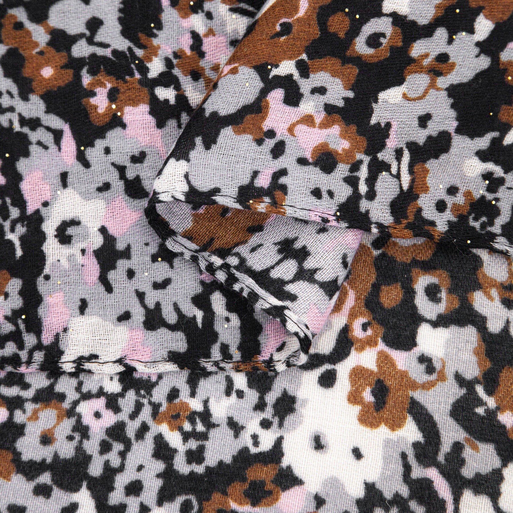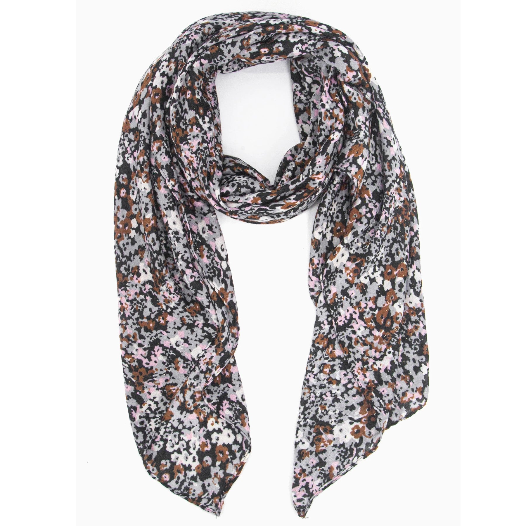 A classic floral designed scarf in neutral colours of black, grey, brown with a hint of pink and cream. Lightweight enough for the indoors and warm enough for the outdoors.