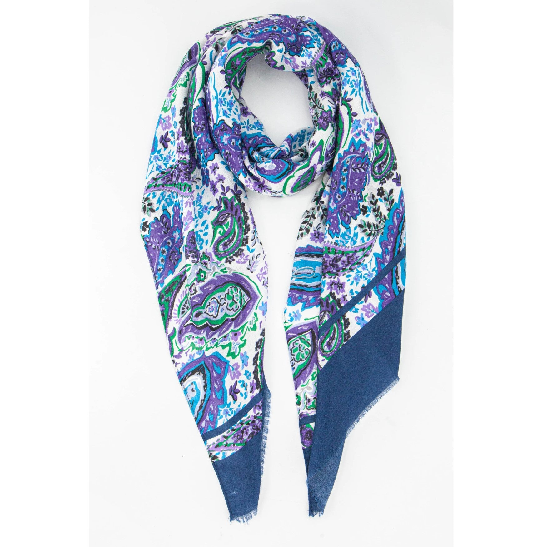 Inspired by vintage paisley print, this lightweight scarf has a navy colourblock border with a raw finished edge.
