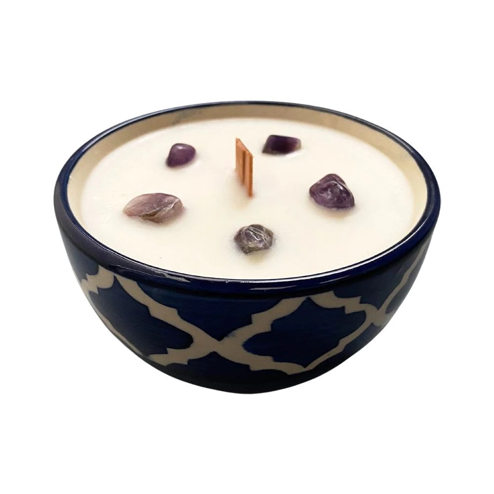 Each candle is thoughtfully paired with specific Amythest crystals to enhance the ambience and energy in your space.