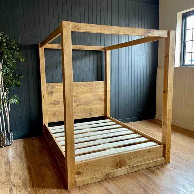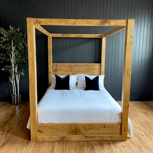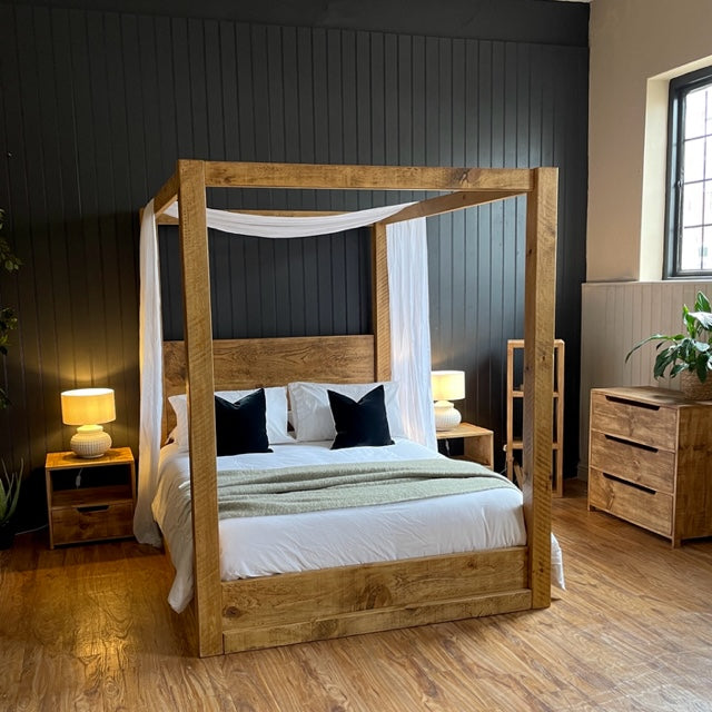 The Sherwood New Design 4 Poster Canopy Bed is a sturdy classic piece with a contemporary edge, encompassing all the heritage charm of a traditional 4 poster bed, this bed will make a statement in your home. Perfect to swag some gorgeous fabric or fairy lights to create atmosphere in your bedroom.