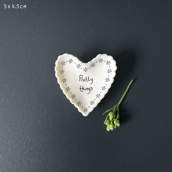Perfect for rings and other little trinkets, it’s a lovely way to remind someone just how special and appreciated they are. Featuring a delicate scalloped edge and intricate floral details it's the perfect gift for any occasion.  Our Small Scallop Heart Dish - Pretty Things is made from 100% porcelain and measures approximately