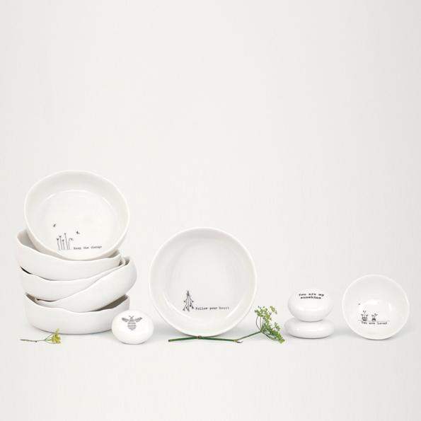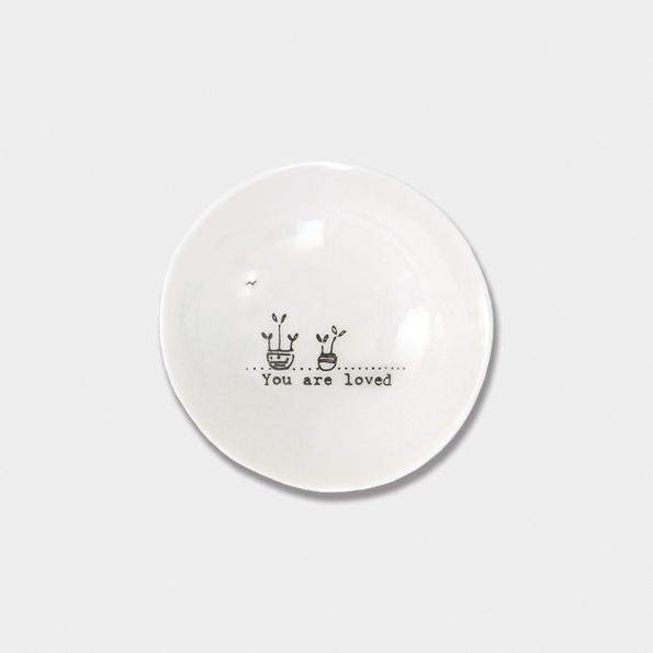 This white porcelain trinket dish with “you are loved” embossed in typewriter style font and a flowerpots illustration, is a sweet gift for your favorite person. With non-uniform edges this piece looks beautifully handmade and is just large enough to contain small jewellery or a couple of coins.