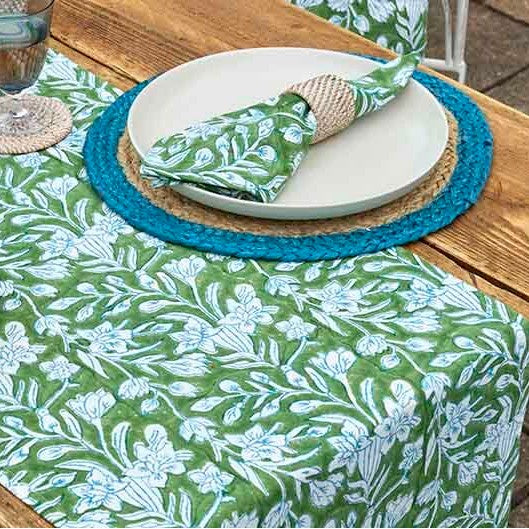 Bring artisanal elegance to your table with the Lily Hand Block Table Runner in Apple Green, showcasing a delicate floral pattern with vibrant blue accents.