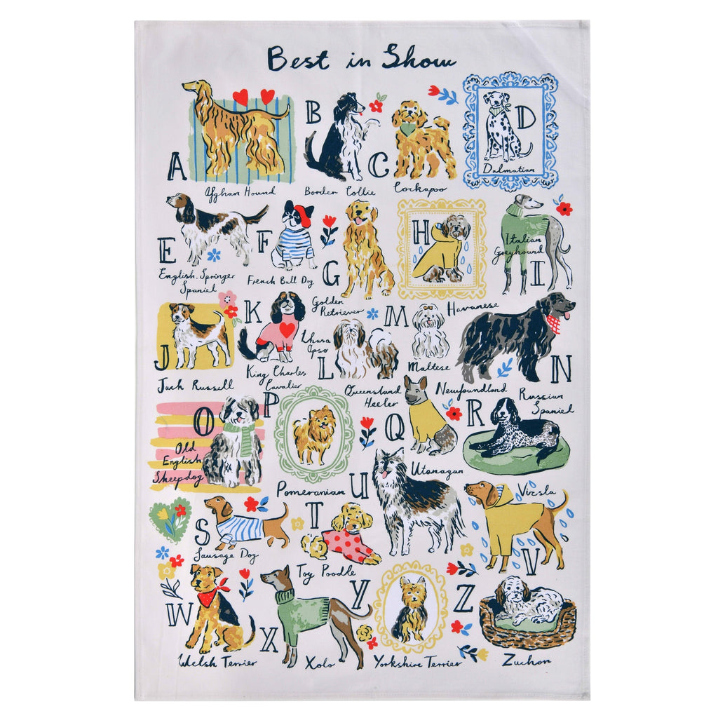 This charming 100% cotton tea towel showcases hand-painted dog designs in gouache and watercolor, with whimsical doodles and stamp borders that bring each breed's lively personality to life. Measuring 74x48cm, it combines durability with style, and the handy hanging loop adds a touch of flair to your kitchen essentials.