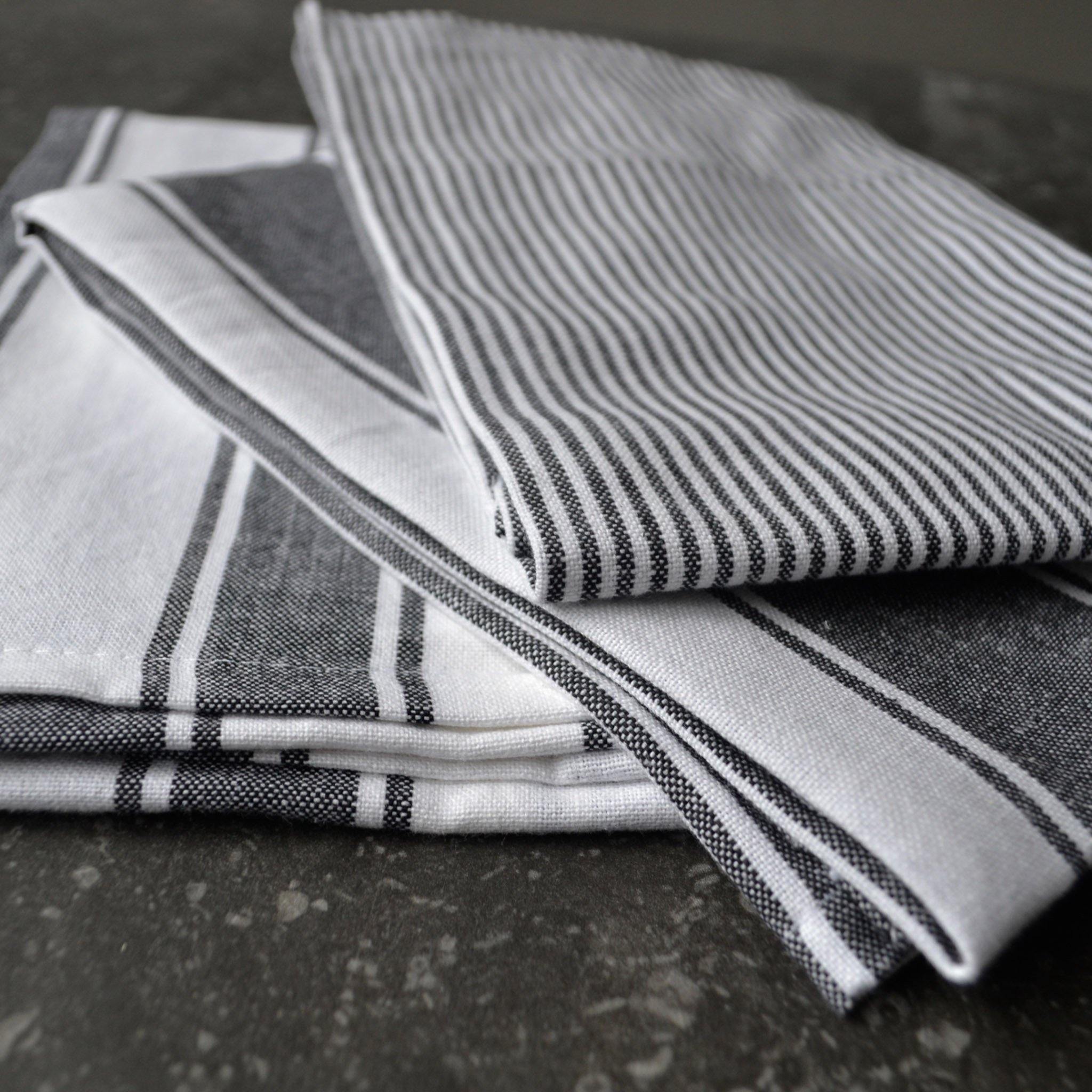 Tea Towels, Set of 3 - Black & White Stripe, each measuring L70 W45cm.