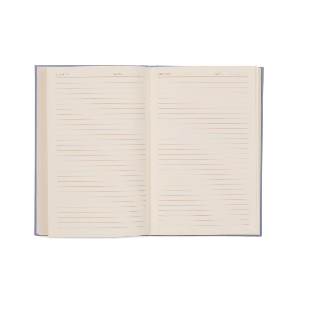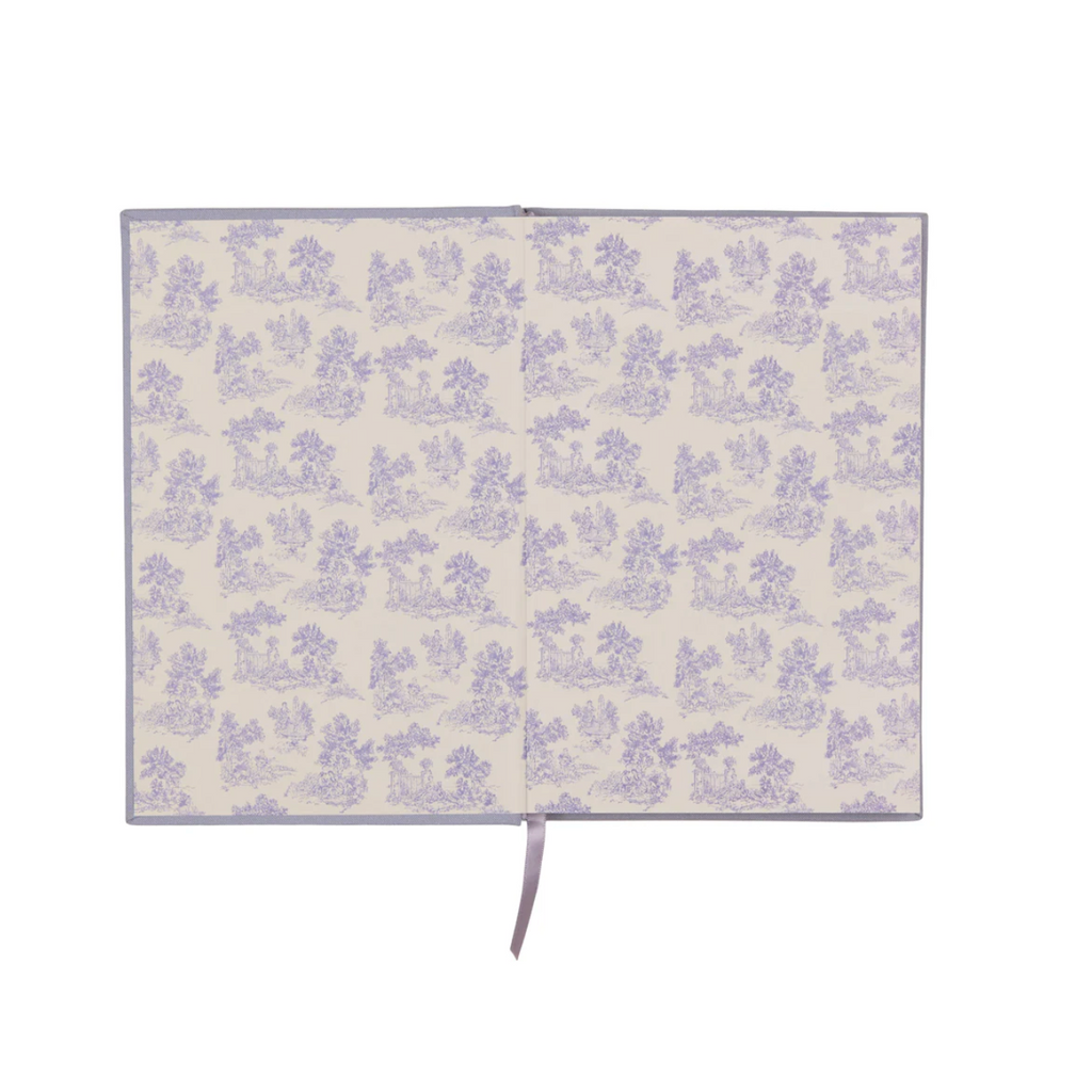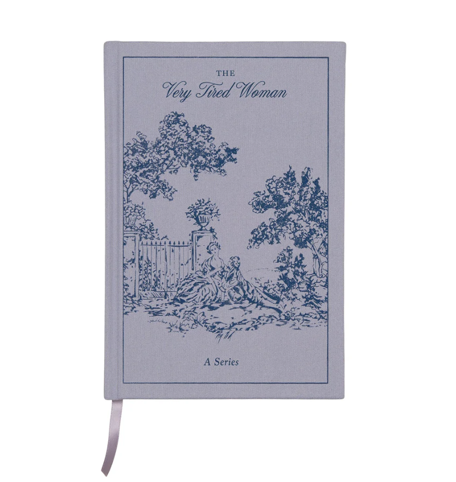 The compact design features a luxurious bookcloth cover, with a lilac and blue colour scheme inspired by Victorian aesthetics, and is titled 'The Very Tired Woman'. Inside the notebook has 240 Lined Pages, Patterned Ensheets, Sewn, Lay-Flat Binding.