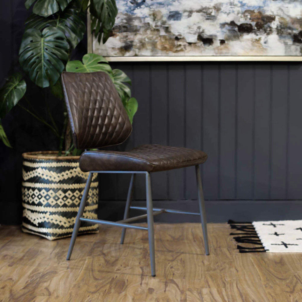 Super comfortable and super cool is this Timothy dining chair. The stitched vintage faux leather and dark grey piped steel legs, together with the fab detail at the back gives it an industrial and vintage car sort of vibe. We love it! Measures: H87 x W59 x D45.5cm Seat Height: 50cm