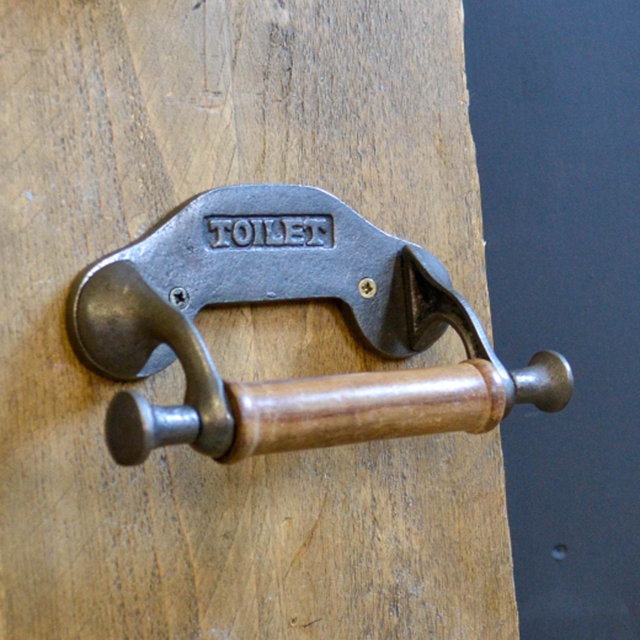 Wall hanging toilet roll holder with curved sides and wooden cylinder has the word 'Toilet' embossed, and is made from 100% cast iron. Measures H10 W19 D8cm