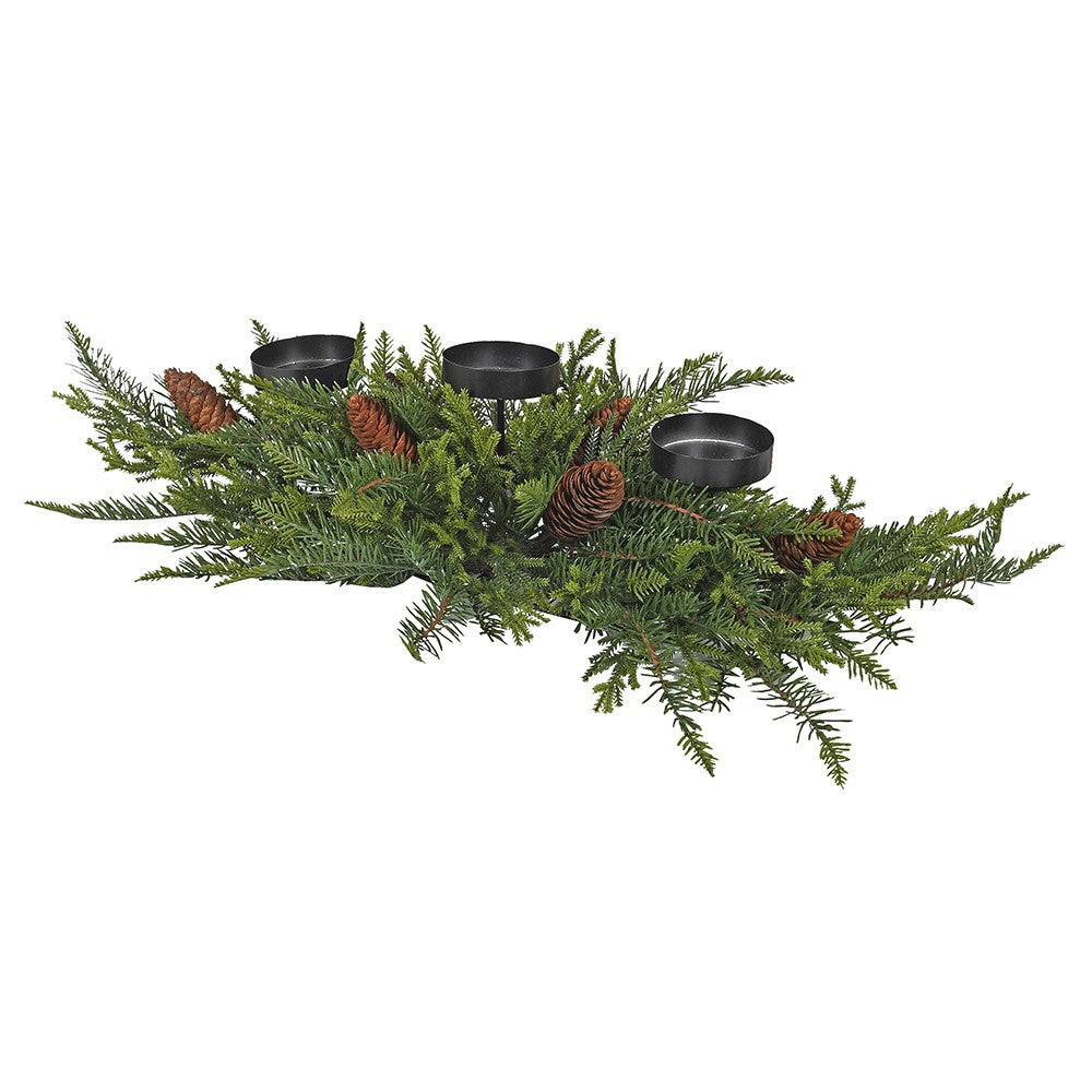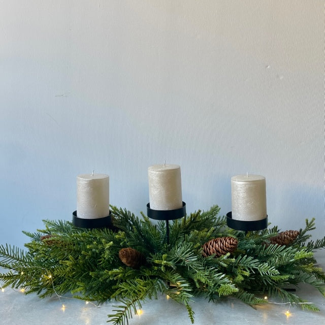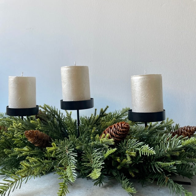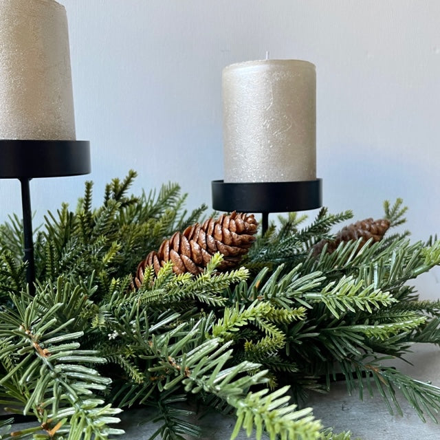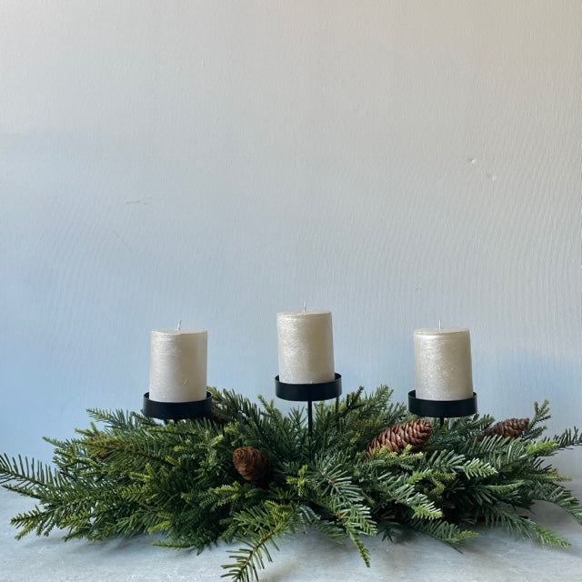 Made from a back metal frame, with 3 tiered candle plates to hold pillar candles. This arrangement features realistic branches of faux pine and fir with large cones to make a true winter woodland-inspired decoration.