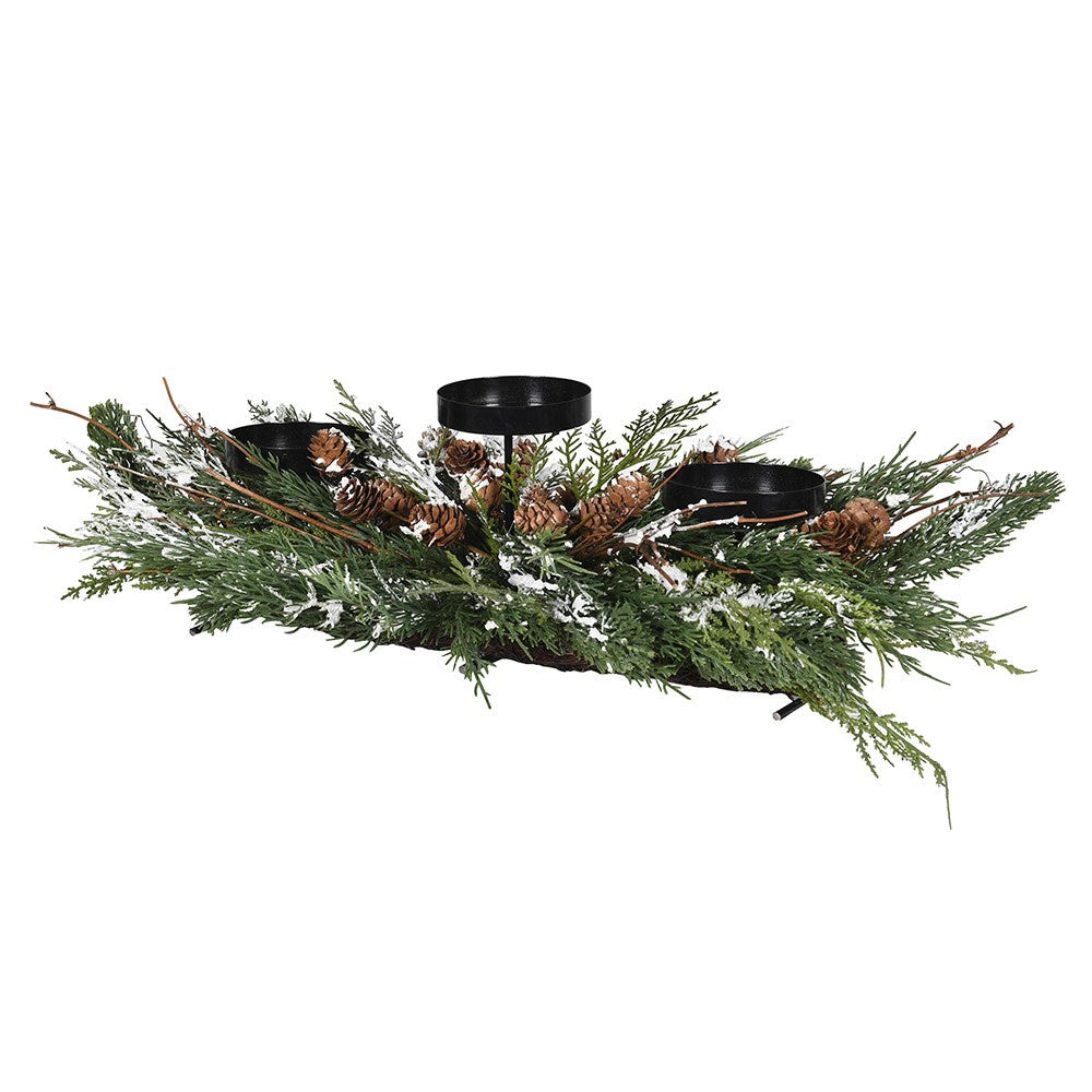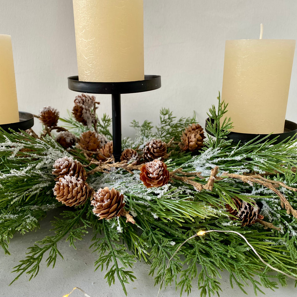 Embracing winter woodland, Triple Pillar Candle Holder - Snow, Cedar & Pinecones, W60cm the most beautiful table center decoration.