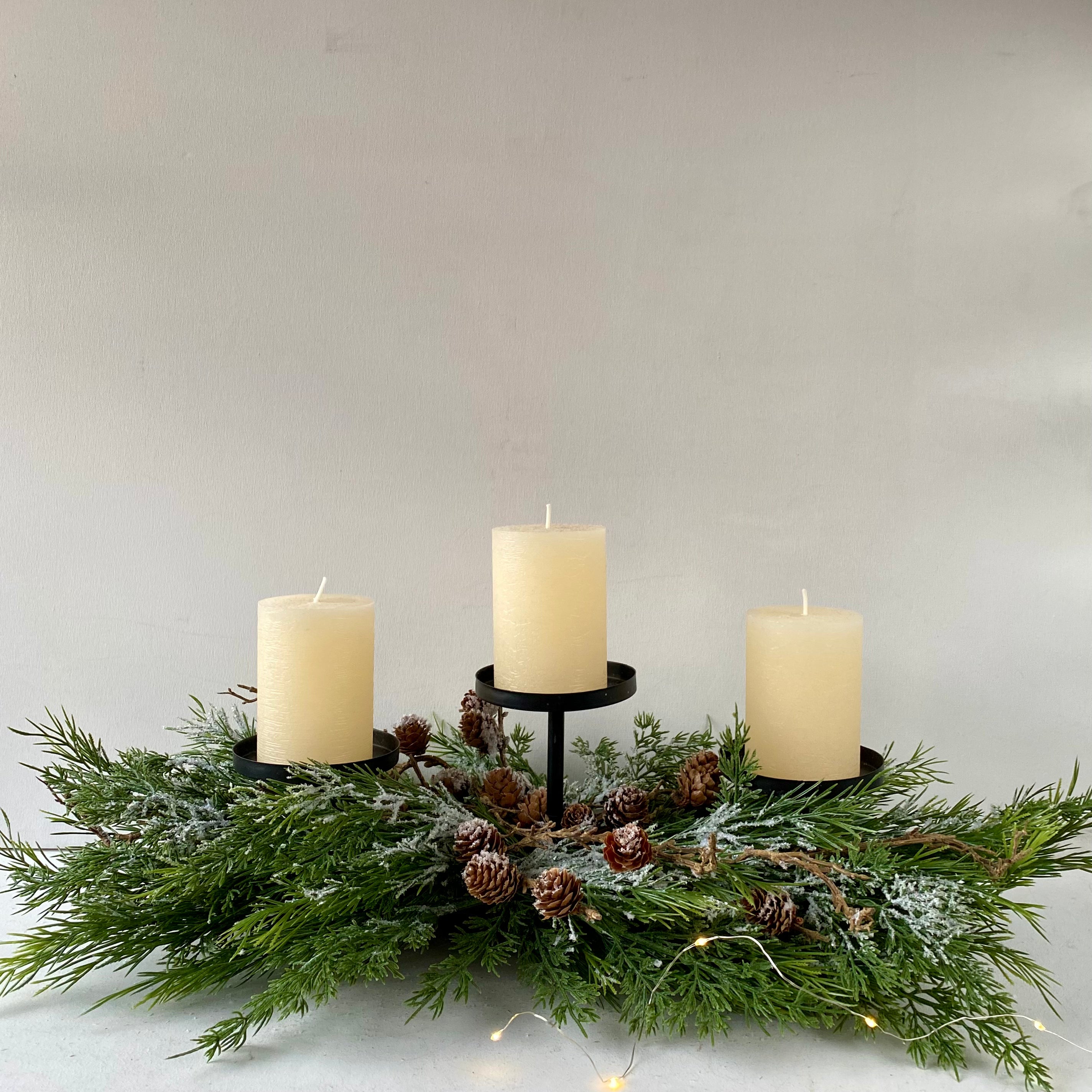 Made from a back metal frame, with 3 tiered candle plates to hold pillar candles. This arrangement features realistic branches of faux pine and fir and snow to make a true winter woodland-inspired decoration.