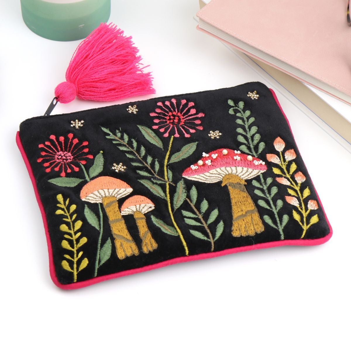 A purse pouch in black velvet with embroidered woodland scene featuring toadstools, embellished with beads and a fun tassel in bright pink to a black zip.