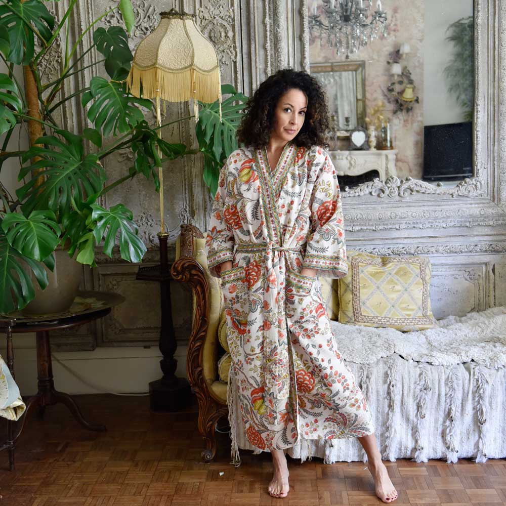 This luxurious cotton waffle-textured bathrobe brings a spa vibe to the bathroom! The robe is printed with a large-scale botanical pattern with exotic flowers with detailed petals in oranges, rusts, and greens against a white background and edged with a patterned border on the cuffs, pocket, and open front and has a matching tie belt.