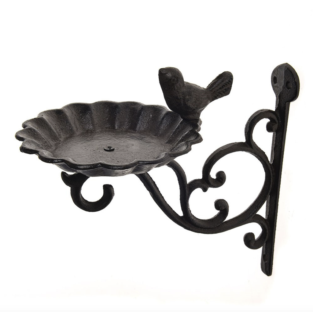 Wall Hanging Cast Iron Bird Feeder - this beautiful rustic bird feeder is mounted on an ornate gothic style bracket, a fluted seed tray and features a pretty little cast iron bird pirched atop.