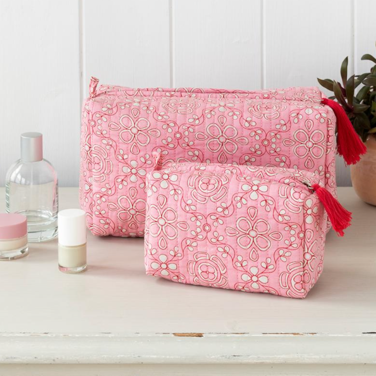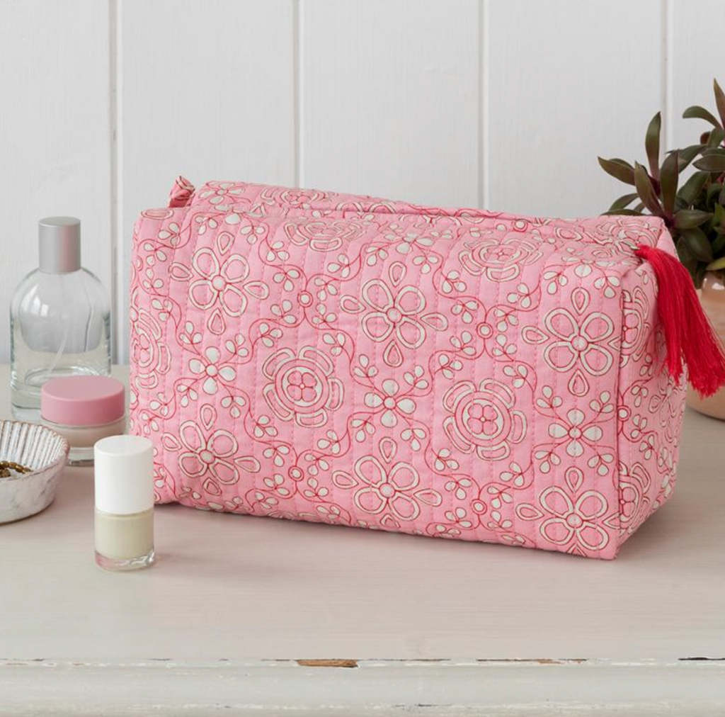 Wash Bag - Anushka Pink - A soft quilted wash bag in pink, decorated with a bohemian tile pattern. The perfect travel companion to organise and carry toiletries and other essentials. This pretty pink makeup bag would make a gorgeous gift for yourself or a loved one.