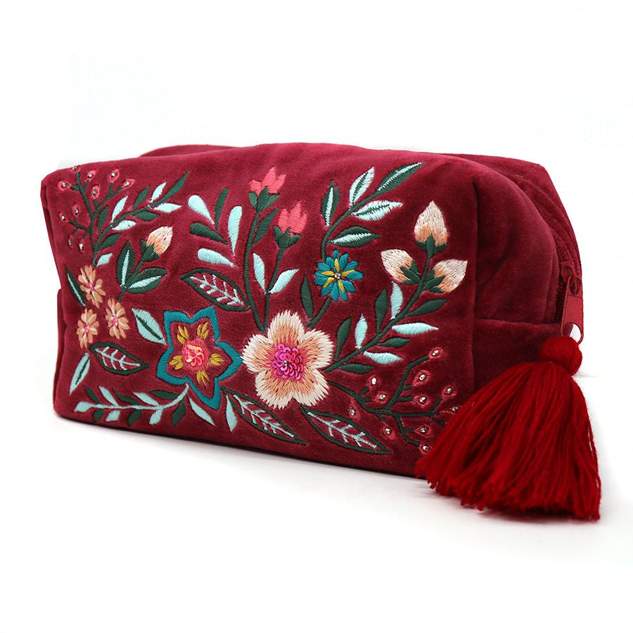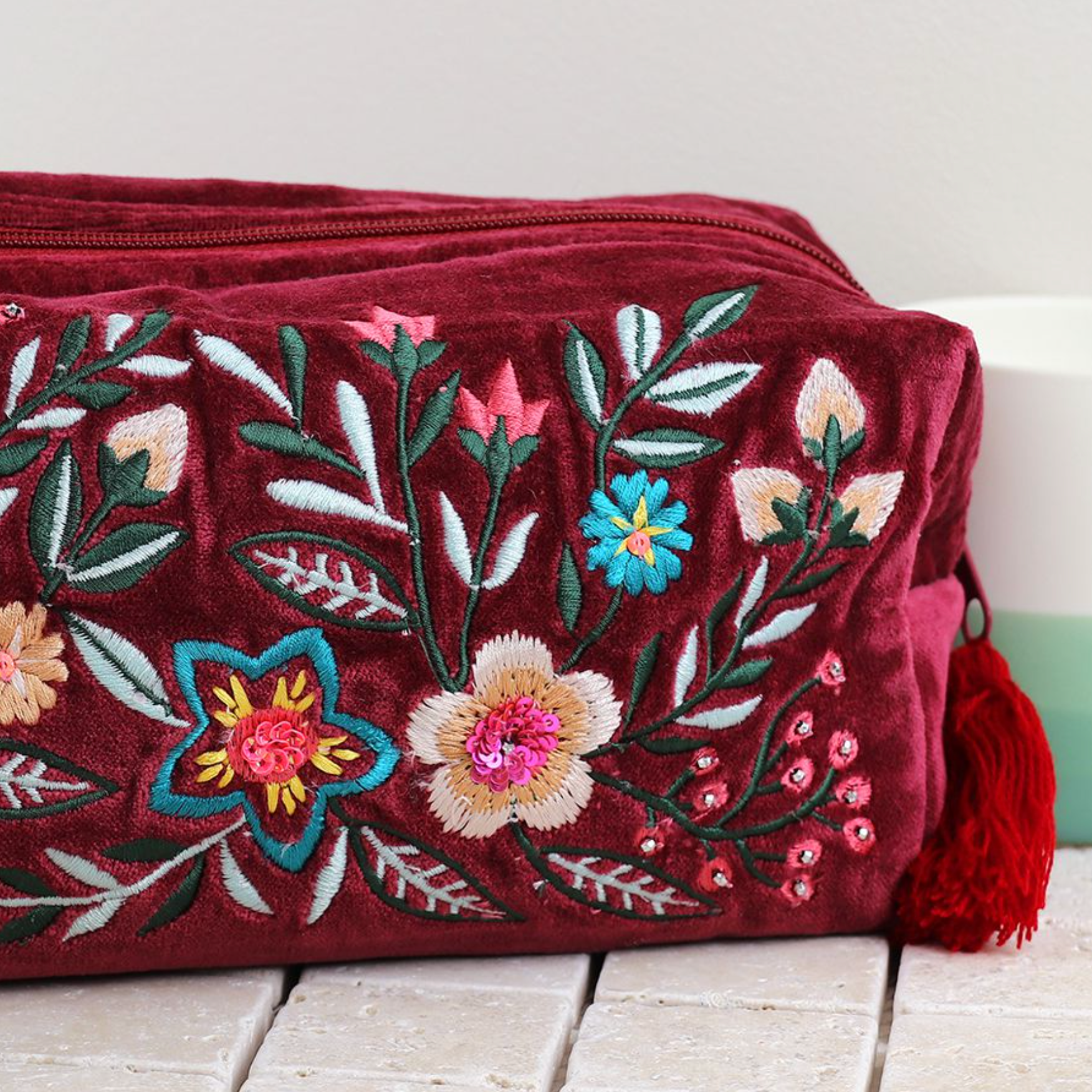 Rich burgundy velvet washbag with floral embroidery and a red tassel zip - a beautiful bohemian addidion to your dressing table. This medium size make up bag would make a gorgeous gift for yourself or a friend.