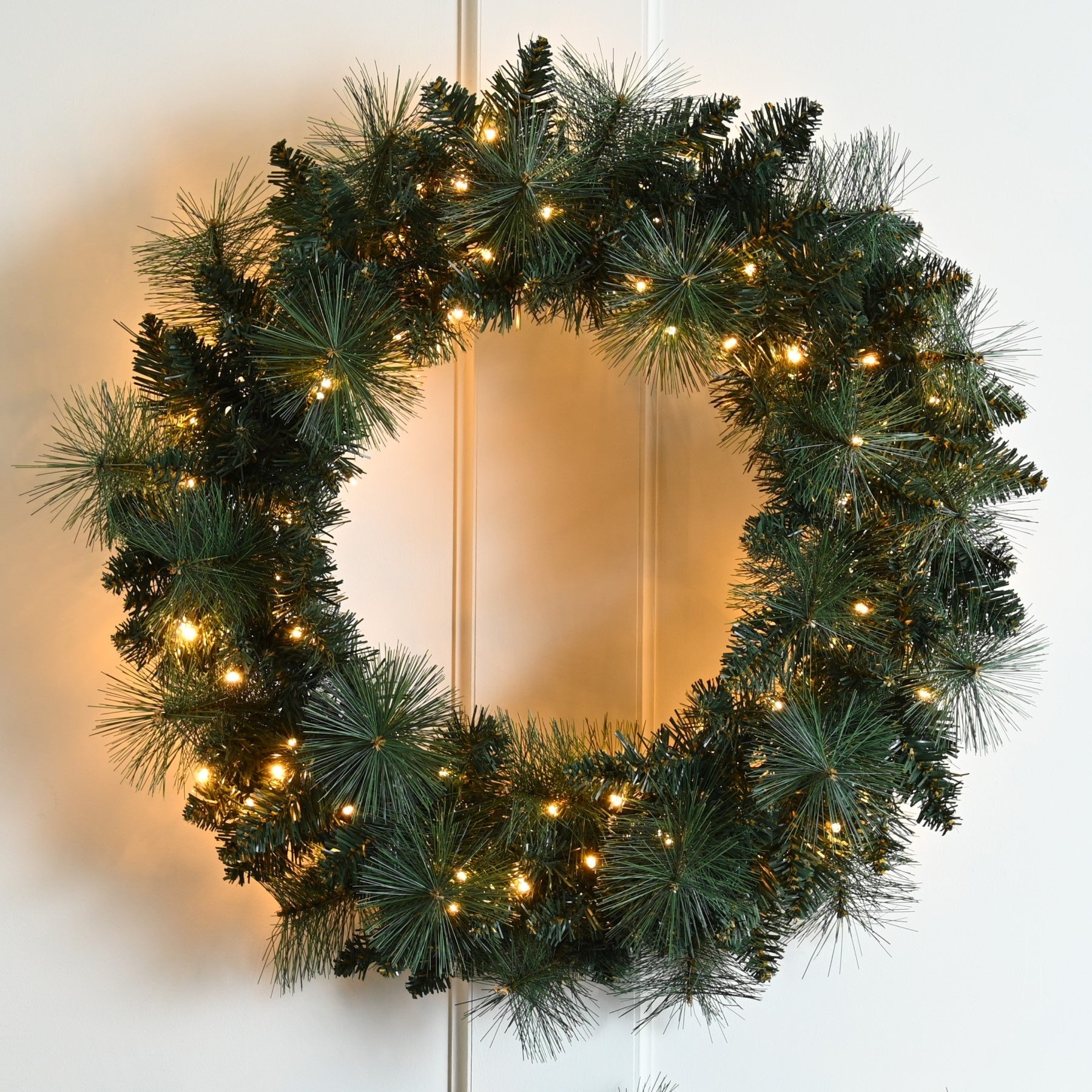 Welcome guests with a warm, festive glow! Our Green Fir BO Lit Firefly Wreath is full, bushy, and beautifully realistic, with mixed fir and pine foliage and 140 warm white LEDs that flicker softly like magical fireflies. Perfect as-is for your front door or use as a base to get creative with extra greenery and decorations.