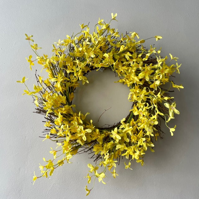 Featuring a vibrant yellow realistic faux forsythia flowers, clustered generously on a spun twig base. This wreath will add a welcome spash of colour to your front door or any spot in your home that needs an injection of spring cheer.